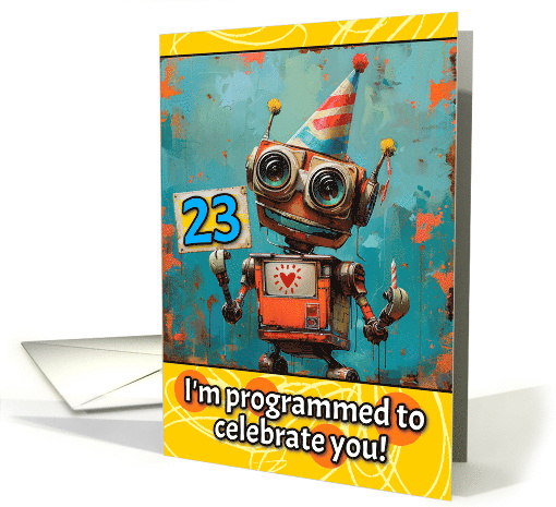 | Artist Notes: | A festive little robot wearing a birthday hat painted in vibrant colors and strong brushstrokes holds up a sign and the text "23 I'm programmed to celebrate you!" on a yellow background with orange circles. A fun card to send to that special 23-year old for their birthday. |