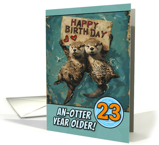 | Artist Notes: | A cute otter duo floating on their backs in the water are holding up a sign that spells HAPPY BIRTHDAY on a teal background with a small pattern, the number 23 in orange, and the text "an-otter year older!" A fun pun card to send to that special birthday boy or girl for their 23rd birthday. |
