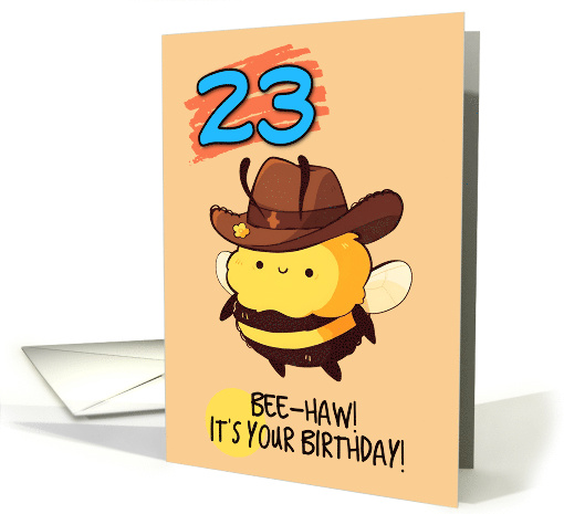 | Artist Notes: | Bee-haw! A cute cartoon bumble bee wearing a cowboy hat on a pale orange background with the number 23 in blue and the text "Bee-haw! it's your birthday!" A fun birthday card with a country twist to send to that wonderful 23-year old for their birthday |
