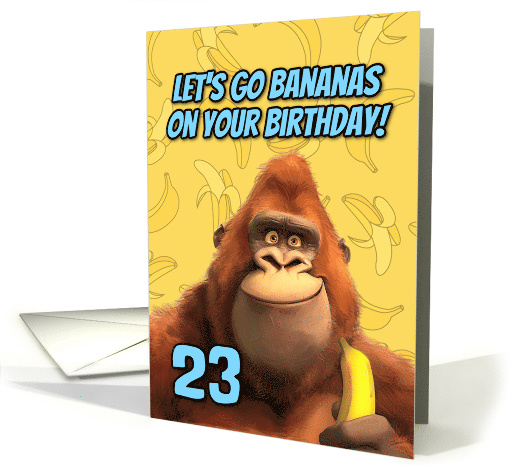 This birthday card features a humorous design with a gorilla as the main subject. The background is yellow with light outlines of banana shapes scattered across it. The top of the card displays bold blue text that reads "LET'S GO BANANAS ON YOUR BIRTHDAY!" This text is styled in a comic book or pop art fashion. The centerpiece of the card is a close-up image of a gorilla with vibrant orange-red fur. The ape has a slightly amused expression with raised eyebrows and a subtle smile. Its eyes are bright and attentive. In one of its hands, the gorilla is holding a yellow banana, which ties in with the "go bananas" theme of the card. The overall design combines the playful text, the expressive ape image, and the banana motif to create a lighthearted and fun birthday greeting.