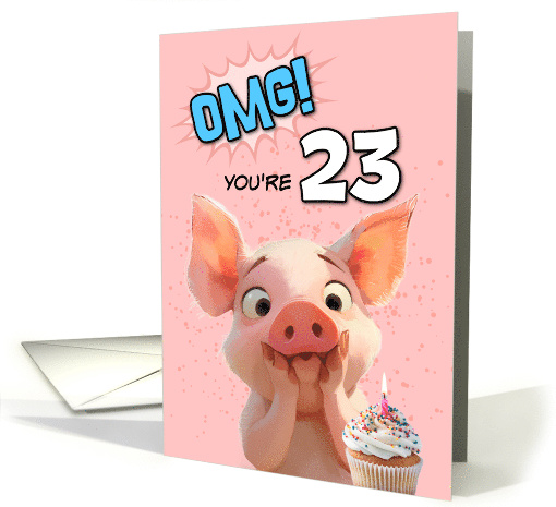 This birthday card features a playful and vibrant animal design. The main elements include a large "OMG!" exclamation in blue text at the top.Then the age written in black and white text. A cartoon-style pig character with a surprised and excited expression, holding its face with its hands (or hooves). A cupcake with white frosting, colorful sprinkles, and a single lit candle in the bottom right corner. A pink background with lighter pink starburst and dot patterns. The overall aesthetic is fun, youthful, and slightly quirky, perfect for a lighthearted birthday celebration.