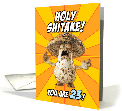 | Artist Notes: | A shitake mushroom has wide eyes and a mouth hanging open in shock as he exclaims "Holy Shitake! You are 23!" on an orange and yellow starburst effect background. A fun card to send to that wonderful 23-year old for their special day. |