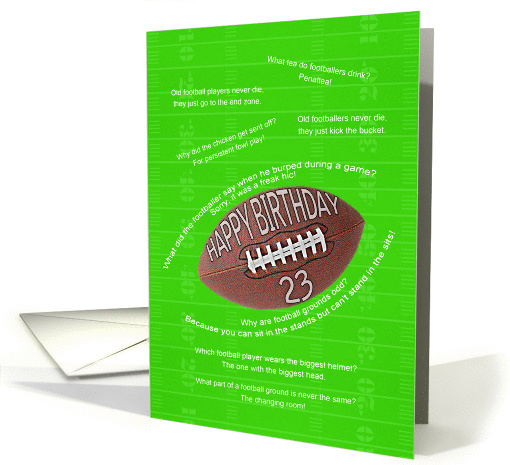 | Artist Notes: | Football jokes 23rd birthday card. A football field with a thrown football and lots of terrible football jokes. |