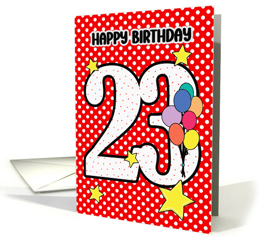 | Artist Notes: | Give a big, bold, and festive 23rd birthday greeting with this design featuring a colorful bunch of balloons and whimsical yellow stars on a field of polka dots. |