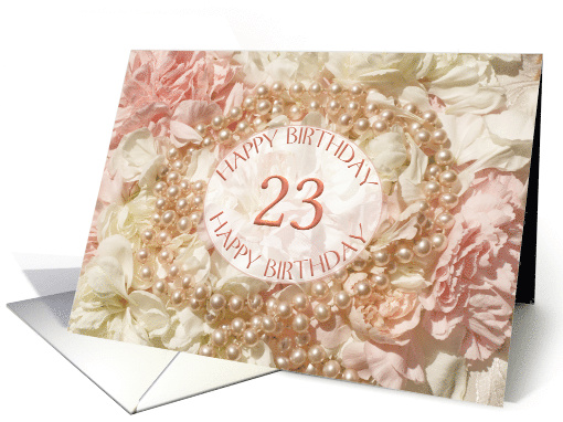 | Artist Notes: | 23rd birthday greetings with pearls and petals. A beautiful way to wish a happy birthday. Pink pearls lie an a bed of pink and white petals. A very feminine card for a woman. |