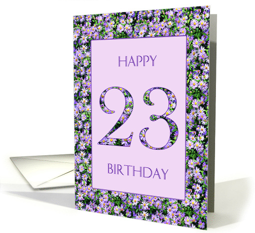 | Artist Notes: | 23rd Birthday card for a lady who likes flowers. An elegant birthday card with a background of purple daisy flowers. This is the perfect card for a girl who loves anything floral or purple! |