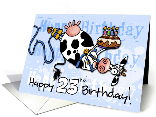 | Artist Notes: | Cow-A-Bungee! A funny cartoon cow holding a birthday cake takes a daring leap on a bungee rope to wish you a Happy 23rd Birthday! |