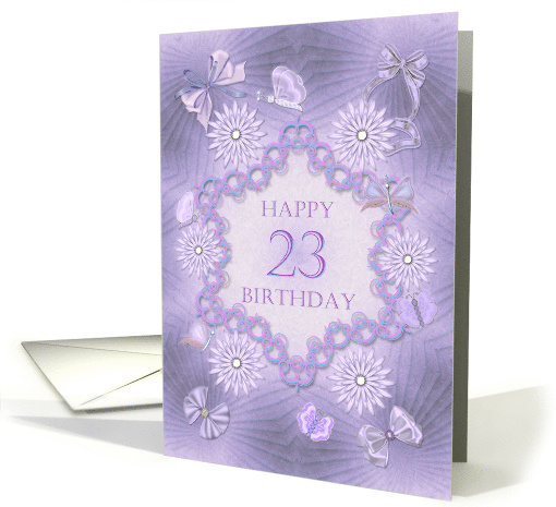 | Artist Notes: | 23rd birthday card. Say Happy Birthday with this dreamy lilac card. Butterflies and flowers on a lilac background. Flowers are always a delightful beauty that adds a refined elegance to any card. This lilac and lavender-hued fantasy flowered card is no exception. A modern take on a traditional look. Inside the card is a lovely verse. |