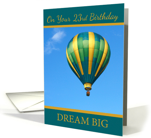 | Artist Notes: | A colorful hot air balloon floats against a bright and clear sky for this 23rd birthday card. Text reads "On your 23rd Birthday" Across the top of the card and "DREAM BIG" at the bottom. |