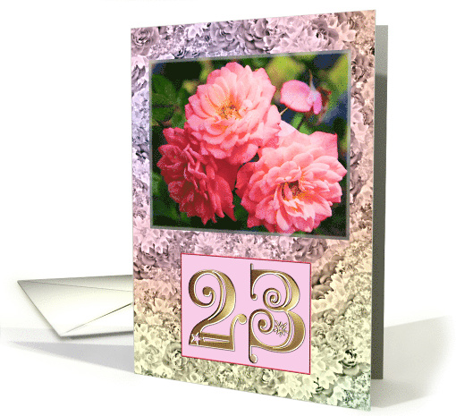 | Artist Notes: | 23rd Birthday Card. What a lovely way to say Happy Birthday. Beautiful pink old-fashioned roses with a lovely floral frame. A lovely feminine card perfect for a lady. |