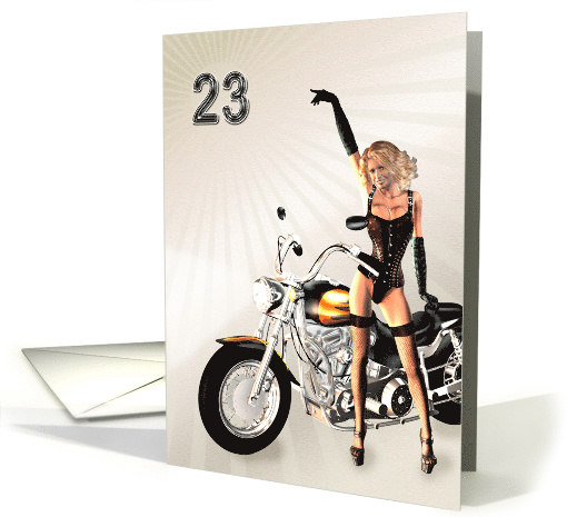 | Artist Notes: | 23rd birthday card for a biker. A sexy girl standing beside a motorbike as she points seductively at the age. Send a provocative birthday card to someone who enjoys biking. |