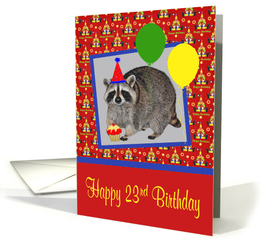 | Title: | 23rd Birthday, adorable raccoon wearing a party hat with a cupcake |