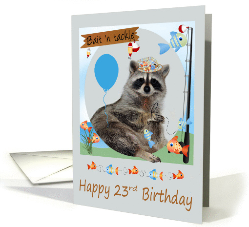 | Artist Notes: | Say Happy 23rd Birthday with an adorable raccoon, Sugar Bear wearing a cute fishing hat, holding a line of fish sitting in a cute frame with a bait and tackle sign with lures. The background is grayish with a blue balloon and brown text. Inside like all GCU cards can be personalized by you if you wish to give it your own personal touch. |