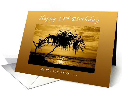 | Artist Notes: | A beautiful, peaceful sunrise with its rich gold tones in a tropical setting and the Silhouette of a palm tree make for a perfect backdrop for your wishes of a Happy 23rd Birthday. |