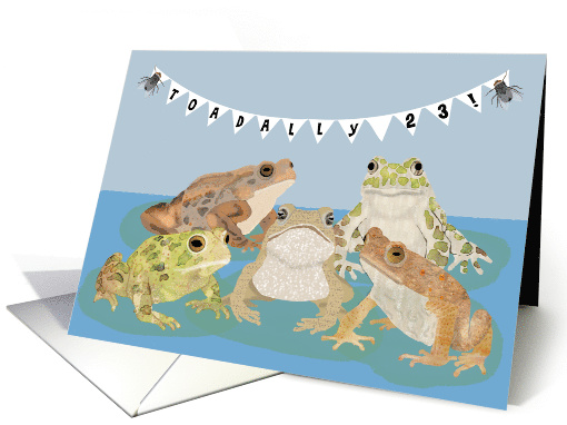 | Artist Notes: | This Funny 23rd birthday card features a grouping of sweet toads on lily pads. Wish them a toadally fun 23rd birthday. |