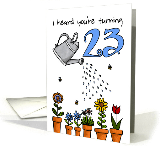| Artist Notes: | This hand drawn birthday card shows a row of colorful potted plants watered by a watering can on a white background, with a humorous punchline inside that will bring a smile to any 23 year old's face. |