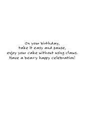 The image shows a charming cartoon illustration of a brown bear holding a small birthday cake. The bear has a gentle, contented expression with half-lidded eyes and a slight smile. Its fur is rendered in warm, golden-brown tones, giving it a soft and cuddly appearance. The bear is holding a yellow frosted cake decorated with red strawberries and a single lit green candle. An un-bear-ably sweet birthday card for any birthday boy or girl of all ages.