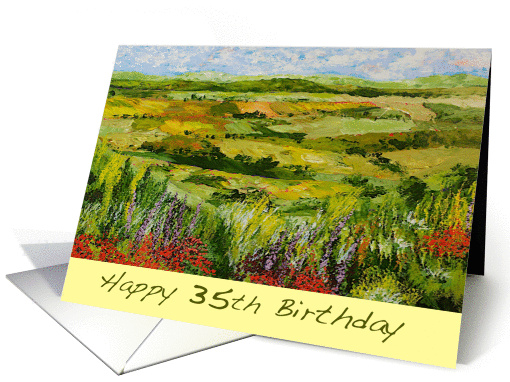 Original landscape painting by Allan Friedlander of fields and hills with red wildflowers. Happy 35th Birthday. You can add or change the inside message to best meet your needs.