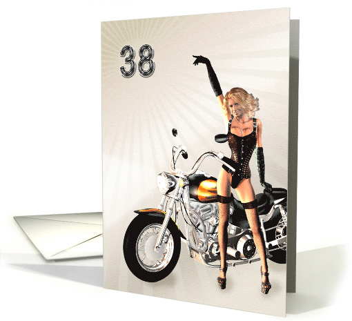 38th birthday card for a biker. A sexy girl standing beside a motorbike as she points seductively at the age. Send a provocative birthday card to someone who enjoys biking.