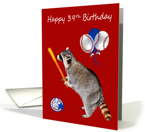 | Title: | 39th Birthday, raccoon holding a baseball bat on red with balloons |