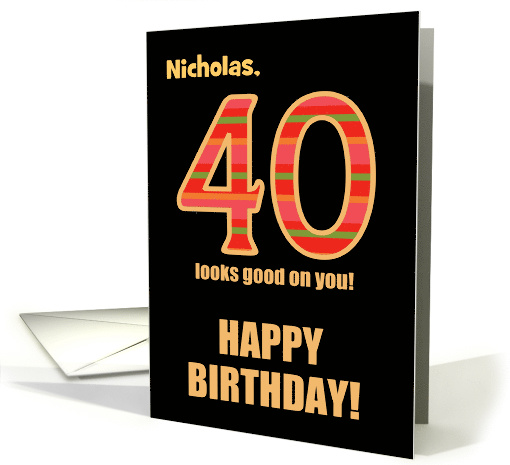 | Artist Notes: | A contemporary 40th birthday card to customize for anyone but which may particularly appeal to a man. There is a large number 40, outlined in gold-effect and filled with bright red, orange and green stripes, on a black background. The front cover greeting says, '40 looks good on you! HAPPY BIRTHDAY!' in bold gold-effect lettering and there is room at the top for you to add the name of the recipient. The inside message can also be personalized. |
