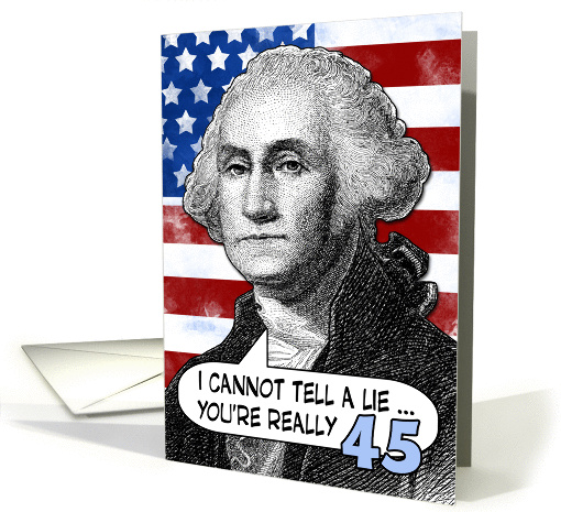 America's first president George Washintgon said: "I cannot tell a lie" - and neither can you with this funny birthday card of the founding father on a vintage Stars and Stripes background. A great card for someone turning 45.
