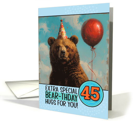 A brown bear wearing a birthday hat and holding a red balloon on a blue background with a small pattern, the number 45 in orange, and the text "extra special bear-thday hugs for you!" A fun pun card to send to that special birthday boy or girl for their 45th birthday.
