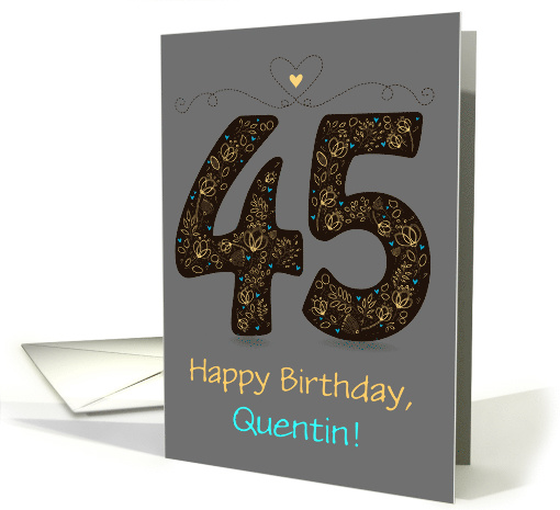 Floral Romantic 45th Birthday Card. Custom Text Front. Brown Number Fourty Five with Graceful yellow flowers and plants and small blue hearts. Place for custome text or name - Happy Birthday, Quentin. Brown decor with yellow heart. Gray background.