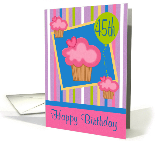 Say Happy 45th Birthday to anyone with a striped colorful design decorated with cupcakes and a balloon.
