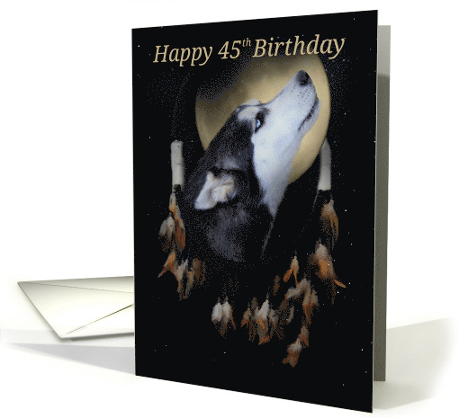Dream Catcher 45th Birthday card with a starry sky and a pretty blue eyed husky dog. Wish someone that their wishes come true