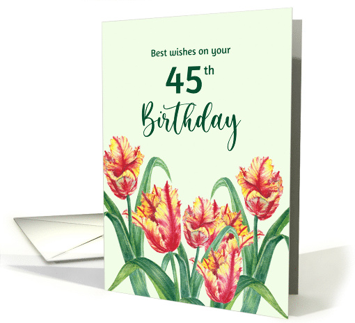 Designed based on watercolor botanical flower portrait of yellow parrot tulips by myself, Farida Greenfield. Bright vibrant multi colored tulips with their delicate petals and fresh green leaves. The design is for 45th Birthday wishes.