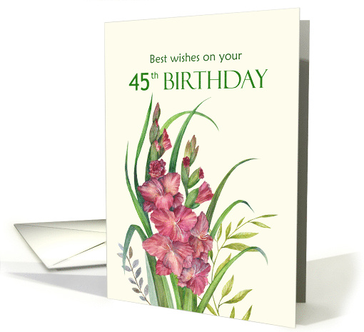 Beautiful card designed by myself Farida Greenfield based on my watercolor botanical illustration warm peachy salmon colored gladioli surrounded with fresh green leaves around them. The design has light cream background which created a contrast and made the flowers stand out in the picture. The design is for 45th Birthday wishes.