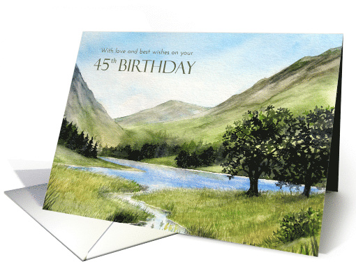 Share the beauty of Lake Buttermere with this heartfelt greeting card, featuring a watercolor painting by myself, Farida Greenfield. Escape to the serene surroundings of the Lake District, Cumbria, North of England with this peaceful scene of green hills, conifer woods, and a tranquil stream leading towards the shimmering lake. Whether you've visited during a holiday or dream of exploring this breathtaking destination, this card is a lovely way to spread joy and relaxation to those you care about. The card design is for 45th Birthday.