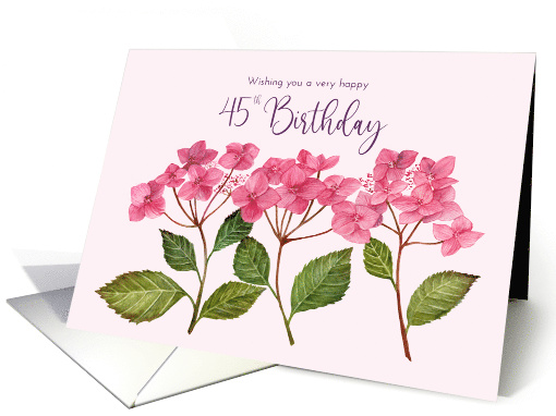 Share the beauty of nature with our elegant greeting card, featuring a stunning watercolor illustration of pink hydrangea lacecaps. This botanical design is sure to uplift spirits and bring a touch of summer joy to anyone who receives it. The card design is for 45th Birthday.
