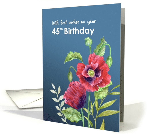 Beautiful card designed by myself Farida Greenfield based on my watercolor botanical illustration red poppies surrounded with fresh green leaves around them. The design has dark navy blue background which created a contrast and made the flowers stand out in the picture. The design is for 45th Birthday.