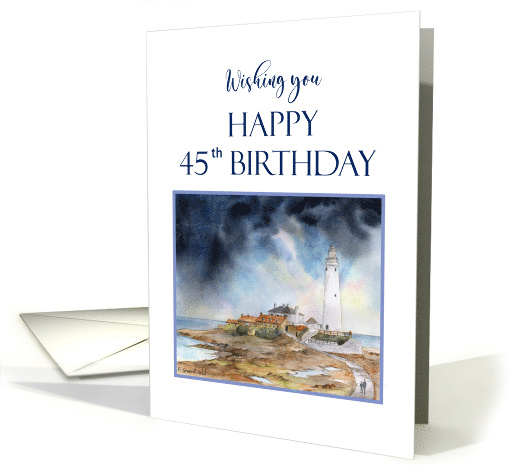 Watercolor painting by Farida Greenfield of St. Mary's Lighthouse in Whitley Bay, near Newcastle upon Tyne in North East of England. Beautiful view of the lighthouse with stormy clouds on the background and sandy beach on the foreground and causeway stretching towards the lighthouse. The card is designed for 45th Birthday.