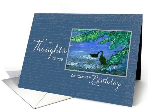 Peaceful river scene painting with duck & geese silhouette on the front of an 45th birthday card. Designed by Rycky Creations; painting by R. Chaffin.