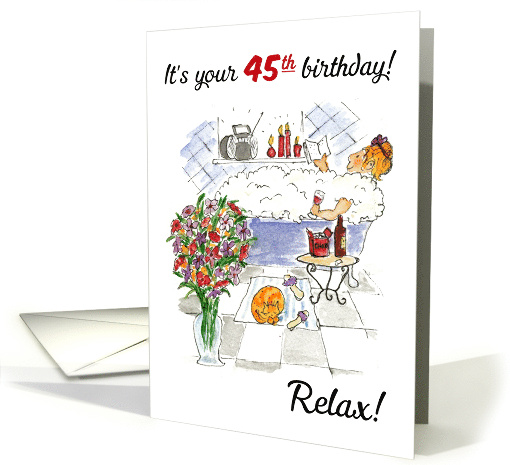 A 45th Birthday Card for a woman, with a whimsical illustration of a woman relaxing in a bubble bath with a book, candles, wine, music and flowers and a ginger cat, curled up on a bathmat beside her. The text says, 'It's your birthday! Relax!' And the inside message, which you can change, says,'Happy Birthday!'