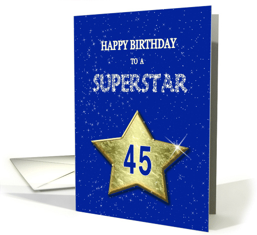 45th birthday card for a superstar. A big gold star carrying the age floats in the heavens. In the background stars twinkle. A great birthday card for someone very special.