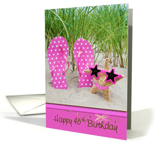 Starfish with star sunglasses and polka dot flip flops in beach sand for 45th birthday. Starfish is wearing a polka dot bikini bottom.