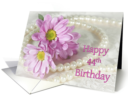 44th birthday card with daisies and pearls lying on a lace cloth. A delightful card for any lady. Give birthday greetings with a truly feminine card.