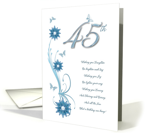 45th Birthday in teal. A floral scroll with stylized flowers and delicate butterflies. A stunning birthday card. A lovely verse adds the finishing touch!
