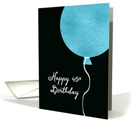 "Happy 45th Birthday". A modern, graphic Birthday card, featuring a blue foil/glitter-effect balloon tied with a white dangling string. You can edit message inside.