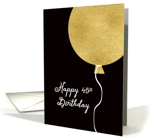 "Happy 45th Birthday". A modern, graphic Birthday card, featuring a golden foil/glitter-effect balloon tied with a white dangling string. You can edit message inside.