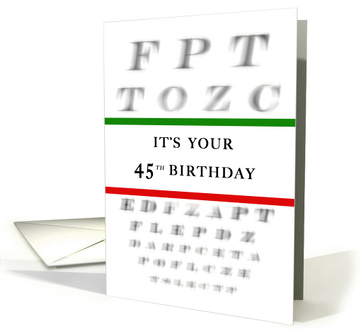 This blurred eye chart with the words "IT'S YOUR 45th BIRTHDAY" clearly focused in the middle of the card is a great card to show someone that they are the center of attention on their 45th birthday.