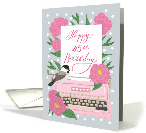 A pink vintage typewriter surrounded by flowers and leaves with a chickadee bird perched on the typewriter. A piece of paper from the typewriter has the handwritten words Happy 45th Birthday. A lovely birthday card for someone special turning 45 today!
