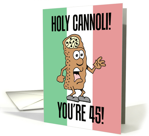 Holy Cannoli You're 45 featuring a funny, cartoon Italian pastry with a surprised expression! On the inside, it says "Have a happy 45th birthday, capiche?" Great for someone Italian!