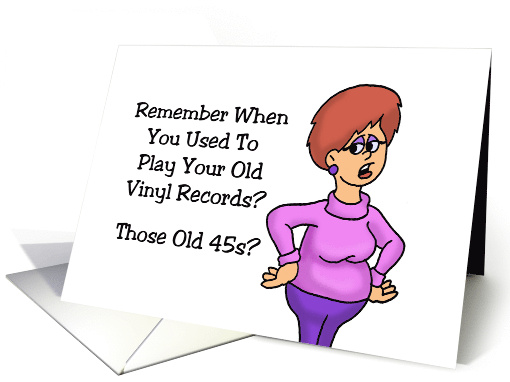 Humorous 45th Birthday card with a cartoon woman, and the words: Remember when you used to play your old vinyl records? Those old 45s? Inside says: Now you are one! Happy 45th birthday