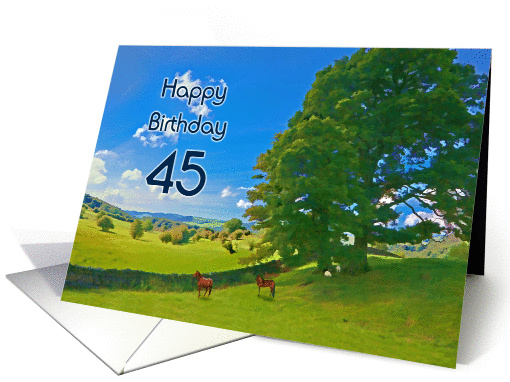 A tranquil painting showing farm fields in the countryside. Horses and sheep graze peacefully under a tree. the sun sines from a blue sky with fluffy white clouds. The picture is of the Lake District in the UK. Copyright Norma Cornes