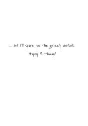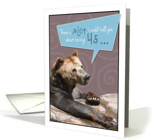 This humorous birthday card shows a photo of a grizzly bear resting on a stone wall, seemingly talking to the recipient through a light blue speech bubble, with fun fonts, about turning 45. Inside of the greeting, this wild animal decides to spare the "grizzly details" of getting older.
